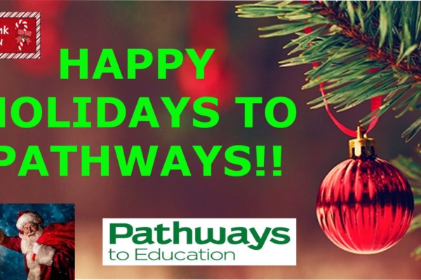 "Pathways to Education has provided countless students with amazing resources to build a great future for themselves. I wanted to represent that within the festive theme by adding some academic elements such as the blackboard behind Santa. One of the most important values that Pathways shares is diversity and inclusivity, so I waned to ensure that the design didn't just include Christmas celebratory elements, but other holidays that are celebrated by many, such as Hanukkah. I wanted to make the design be something that is recognizable to be festive by all people, so I added things such as candy canes, presents, stars and more to put people in the holiday spirit!" –Fatima
