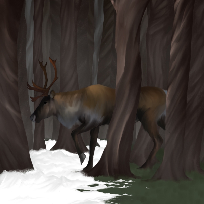 "Voici mon dessin dans celui-ci il y a deux éléments principaux. Le premier est un renne au nez rouge. Le renne se trouve sur une colline de neige. Il est souriant et a de belles pomettes rose framboise. Son nez, comme l'indique son nom, est un rouge vif et le rend encore plus mignon. Ensuite, il y a un petit collier rouge avec des grolots or. Ses oreilles ressemblent un peu a celles d'un chat. Puis, ses bois sont grands et d'un brun foncé. Le deuxième élément de mon dessin est un guirlande rouge et des boules bleus et mauves. Finalement, il y a une tombée de flocons et un beau message chaleureux ''joyeux noël'' en vert forêt." –Audrey