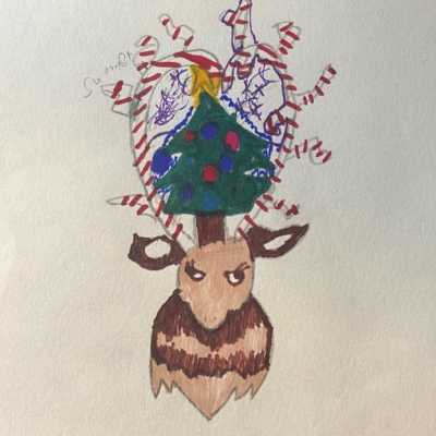"It's just a simple and fun drawing made to create a little fun holiday spirit. It has all the components that define Christmas such as cookies, candy, a Christmas tree and presents. All of these drawings were made to be fun sized so they can look more wholesome and lastly the character itself is just someone you would expect that is celebrating and giving out the holiday spirit." –Hadi