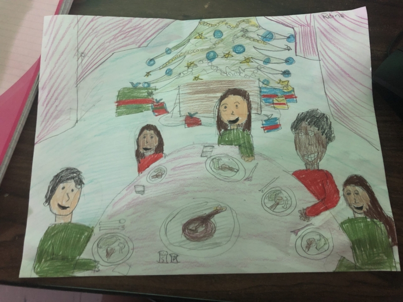 "When I think of the holidays it reminds me of the comfort of my home. So that is why I decided to draw a picture of what my house looks like during Christmas. My house has a beautiful green tree, stockings on the wall and an important snowman painting. Every Christmas my family puts up this snowman painting that was passed down to my parents from my dad's grandparents. Hope you have an amazing Merry Christmas!" –Ajeen