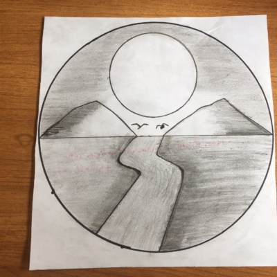 "Ce dessin me fait rappeler d’une nuit sombre avec des feux brillants. Ce symbole pourrait être utilisé dans le henné et le tatouage. Mon dessin est une lune accompagnée de plein de fleurs. Ce dessin était inspiré d’un de mes cours d’art. C’était un mandala. En tout cas, je suis très fière de mon dessin." –Marois